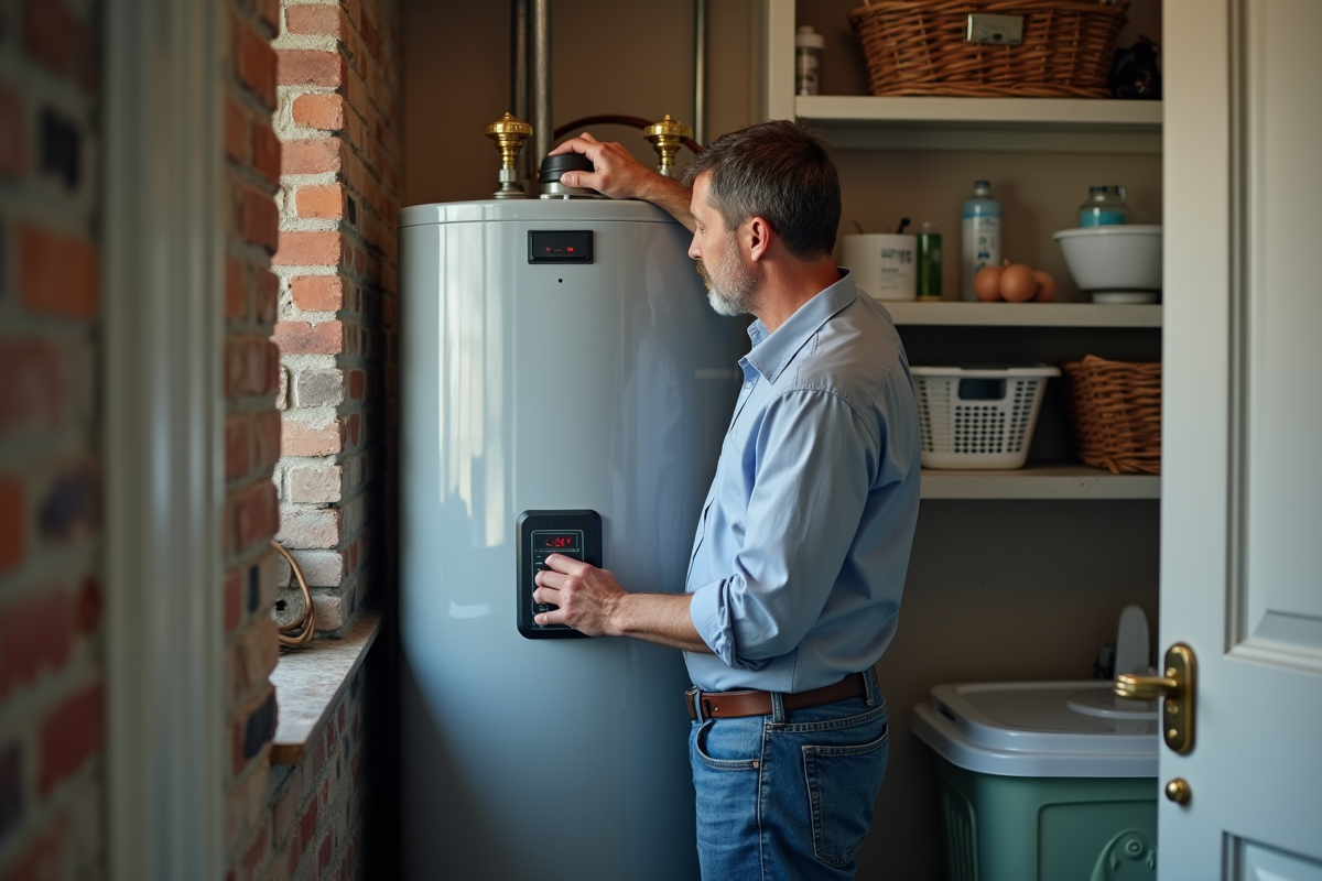 Homme d'âge moyen ajustant un chauffe-eau électrique dans une buanderie